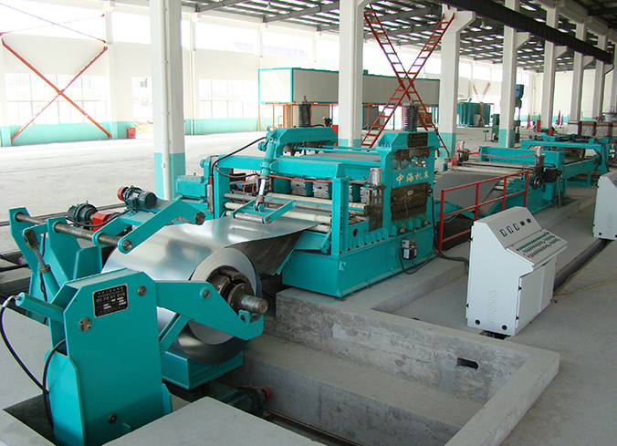 该生产线是将较薄金属卷板整平、剪切成块状板材的专用设备。通常由上料小车、开卷机、托板压引装置、校平主机、活动过桥、导向纠偏装置、定尺机构、覆膜装置、剪板机、输送工作台、气动排料架、液压升降垛料台、运料滚道台及液压系统、电气控制系统等组成,协同动作PLC控制。