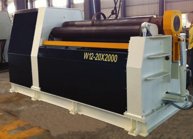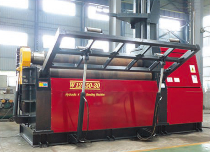 该机结构型式四辊式,上辊为主传动,通过减速机的输出齿轮与上辊齿轮啮合,为卷制板材提供扭矩;下辊作垂直升降运动,通过液压缸内的液压油作用于活塞而获得,以便夹紧板材,为液压传动;在下辊的两侧设有侧辊并沿着机架导轨作倾运动,通过丝杆丝母蜗轮蜗杆传动;该机优点是板材端部预弯及卷圆可以在同一台设备上进行。